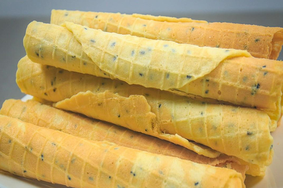 3、照着这个方法把所有的蛋糊全部烙成蛋卷,放凉后会非常焦酥。