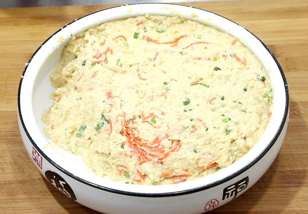 3.准备一个大盆倒入豆渣,把胡萝卜抓软挤压出水分放入盆中,倒入调好味的小葱,打入2个鸡蛋,鸡蛋容易结团口感更加软嫩,把所有原料抓拌均匀,加入面粉50克继续抓拌成团,面粉能增加馅料的抱合力更易成形。