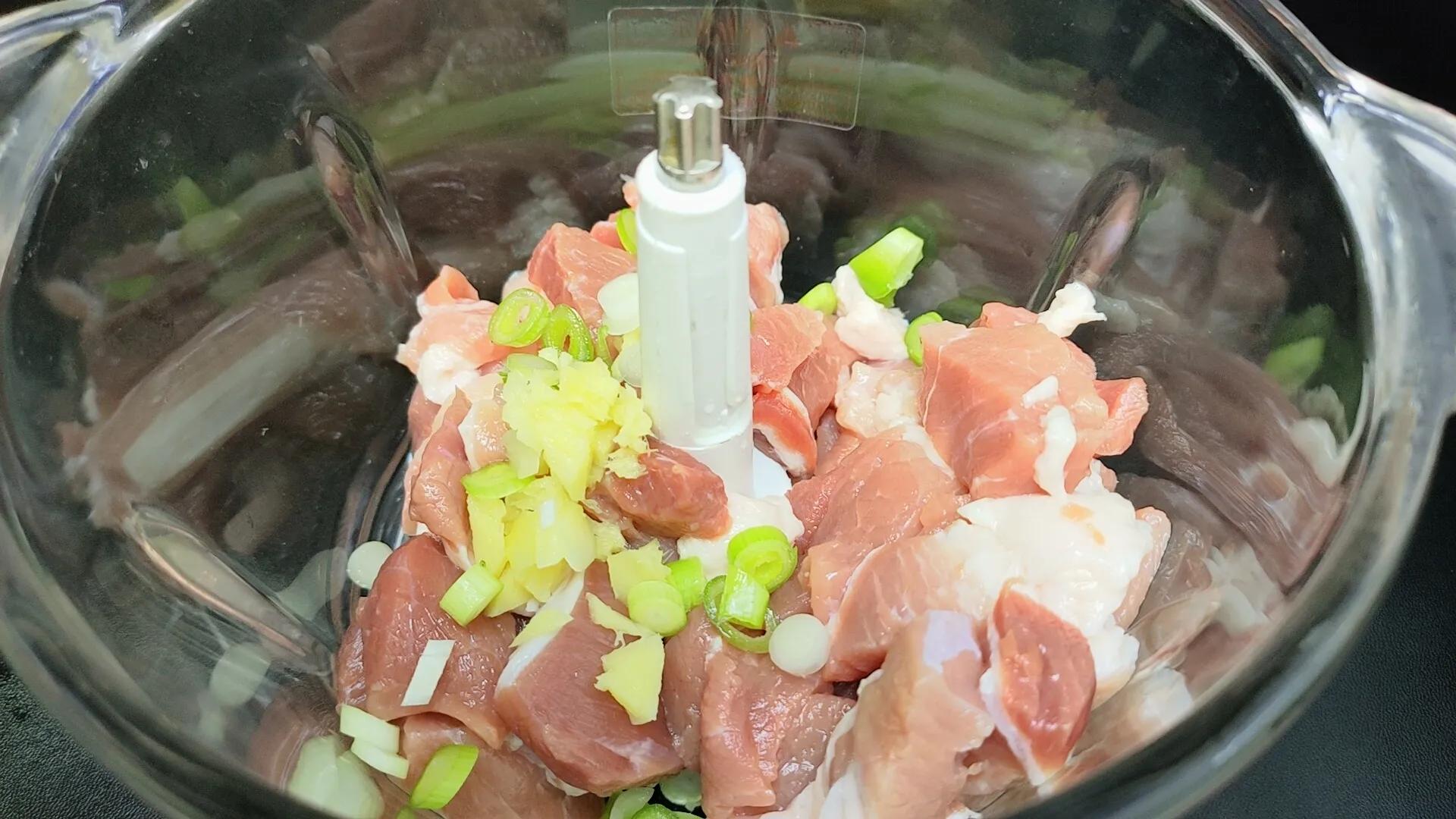 来准备一块去皮的生姜,先用刀拍一拍,在简单的剁一下,小葱白在来一根,切成葱花,切好之后一起放入绞肉机里面一起搅碎,盖盖之后按下按钮,把肉搅成肉末,搅碎之后放入一个大碗中,下面来调个味,加入一勺食盐,半勺鸡精,半勺十三香或者五香粉,一勺生抽酱油,加入一个鸡蛋,在加入两勺玉米淀粉,然后使用勺子搅拌一下,把里面的调料都搅拌均匀,在调这个肉馅的时候,尽量把肉馅搅的碎一些,这样吃起来细腻,而且还不容易松散,大概搅至发粘拉丝的状态就可以了,先放一旁备用。