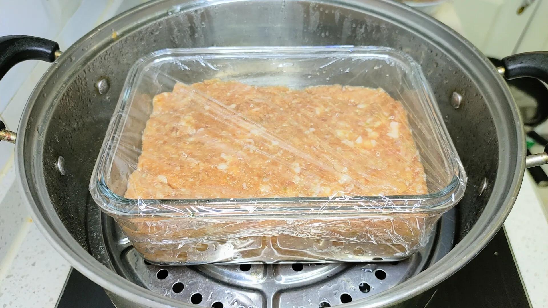 下面准备一个玻璃容器,使用刷子在饭盒的边缘都涂抹上一层食用油,这样在脱膜的时候更容易脱落,然后在把肉馅放入饭盒里面,在使用勺子整理平整,把里面的空气排出,一直把表面处理成光滑的状态就可以了,这样看着也比较美观。接着在蒙上一层食品级耐高温的保鲜膜,这样可以防止水蒸气进入,最后在扎上几个小眼。