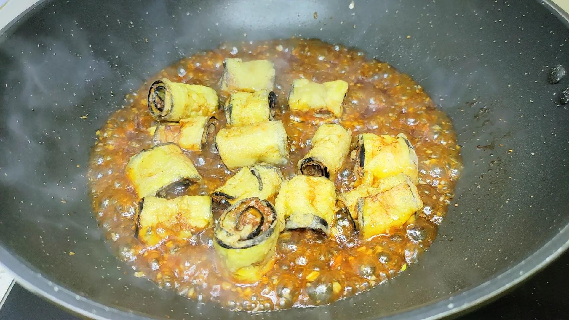 锅中再次加入少许底油,油热之后把蒜末放入锅中,下面开启中小火翻炒一下,把蒜末炸香,一直把蒜末炸到金黄的颜色就可以了,下面把料汁倒入锅中,接着使用铲子翻动一下,把里面的料汁都炒到粘稠的程度就可以了,然后把茄子卷放入锅中,立即开启大火翻炒一下,把茄子都翻炒均匀,一直让茄子都均匀的吸收里面的料汁,这样吃起来会更加的入味,翻炒的时间不用太长,大概翻炒30秒钟左右就可以关火出锅了,下面装入盘中就可以美美的开吃了。