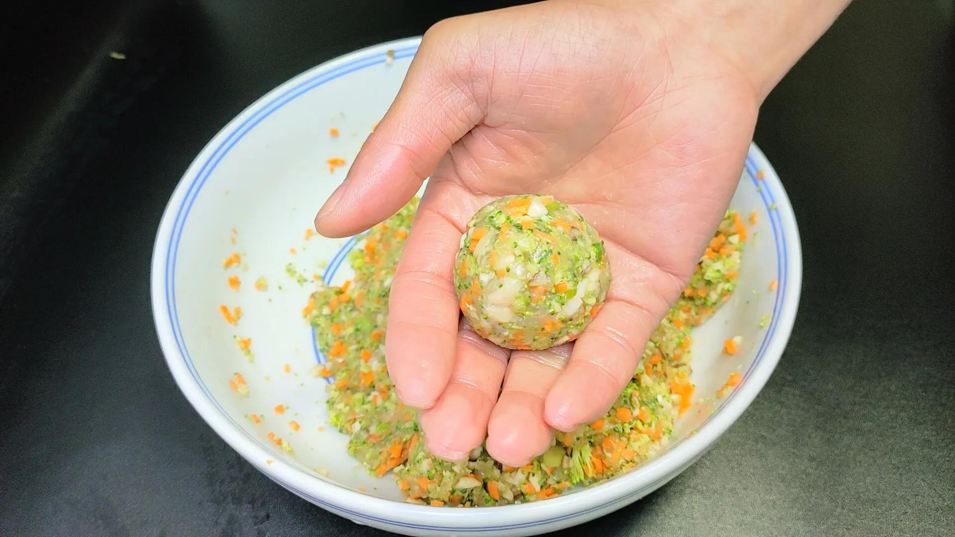 然后使用勺子取上一勺食材,先放在手心,接着使用双手来回的揉一下,一直把它揉成一个小圆球,我们大概给它处理成像这样就可以了,全部做好之后,把生胚放入一个蒸锅里面,放入的时候每个之间尽量分开一点空隙,以防粘连在一起,全部下入之后盖上盖子,上气后计时,中火蒸15分钟。