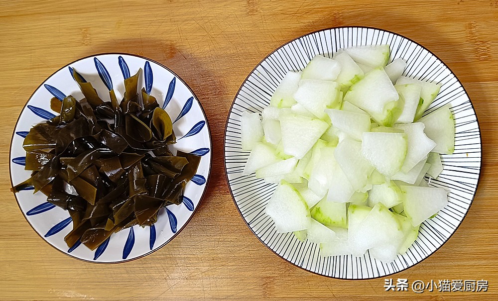 【步骤一】:把冬瓜去皮清洗干净,然后改刀切成薄片装盘备用,海带清洗干净打成接装盘。