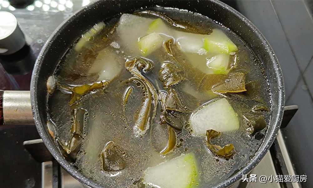 【步骤七】:冬瓜表面炒蔫,放入开水,蒸完的海也带倒入锅中,同时把生姜和八角捡出来,大火烧开炖煮10分钟。