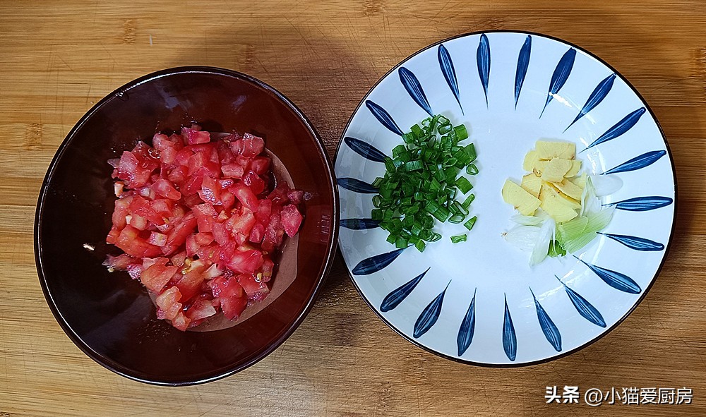 【步骤二】:把西红柿切成丁装盘,生姜切成片、香葱把葱白和葱叶子分开切成末,葱白和生姜放一起,葱叶子末单独放。