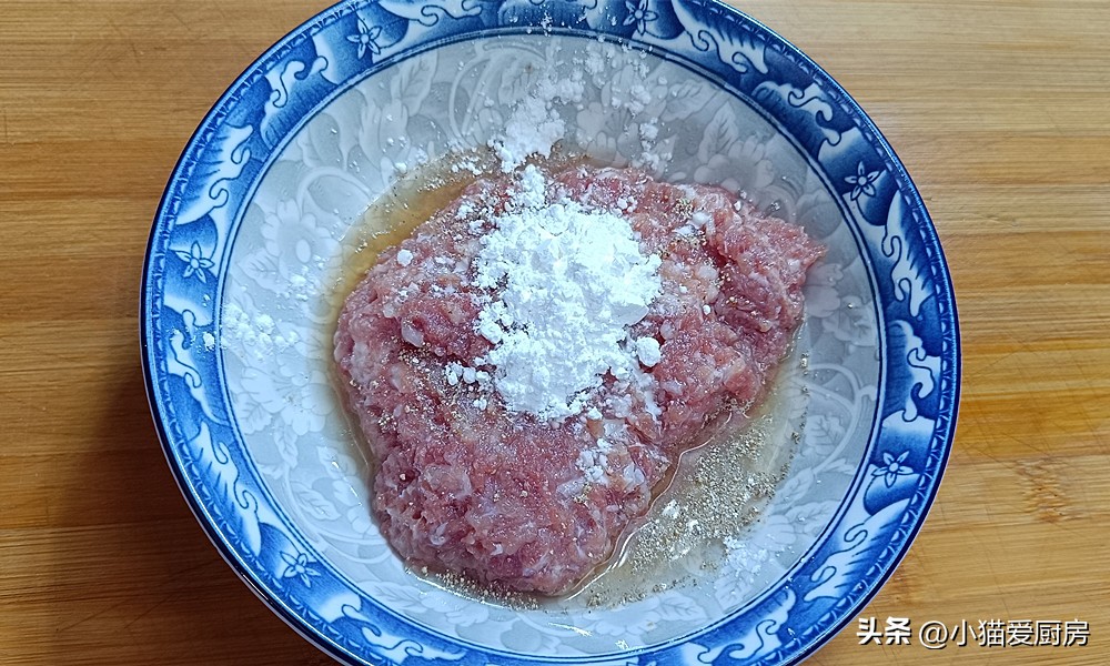 【步骤三】: 把猪肉剁成肉末放入大碗中,同时放入葱姜水2勺、胡椒粉勺、盐少许、料酒1勺、玉米淀粉1勺,搅拌均匀、搅拌上劲,腌制10分钟。