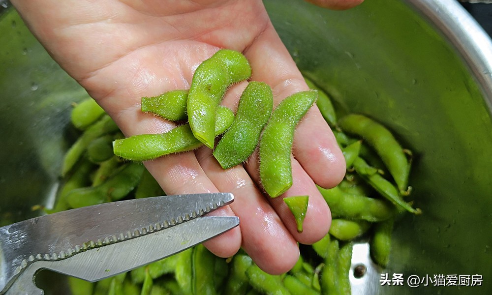 (2)清洗完的毛豆把两头剪掉,这样毛豆容易入味。