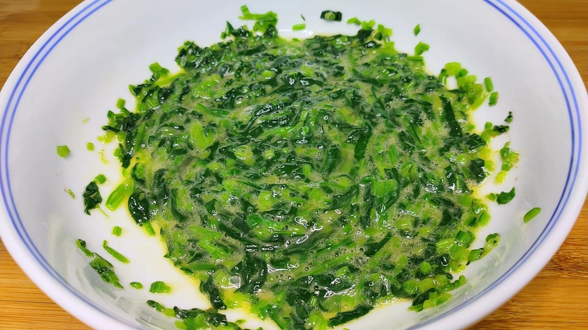 下面锅中加入大半锅的清水,水开之后把菠菜放入锅中,使用筷子搅拌一下,让菠菜都接触到水分,在这里建议大家,在食用菠菜的时候切记要焯烫一下,因为菠菜中有着大量的草酸,否则食用起来不好,大概焯烫一分钟左右给它捞出来,在放入一个盛凉水的大碗中,下面使用筷子搅拌一下,过一下凉水的菠菜翠绿不发黑,然后下手把菠菜攥一下,挤出菠菜中的水分,然后放在案板上,把菠菜切成菠菜碎,切的尽量细一些,这样也方便下一步的操作,切好之后放入一个大碗里面。