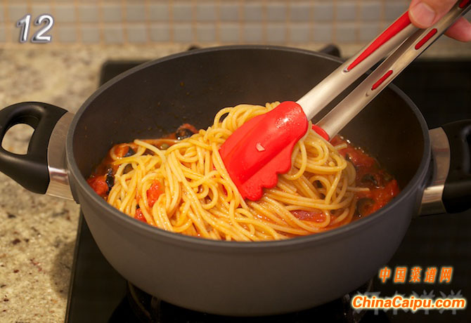 11、通常意面的包装上会标注烹调时间,比如说我们这里用的这种,厂家推荐的烹调时间是13分钟,这是可以直接食用的火候。这里我们把时间缩短到11分钟,把煮过的意面捞出来,直接放入意面酱的锅子里面,继续加热2分钟,或者直至面条的口感达到自己所需的程度为止。