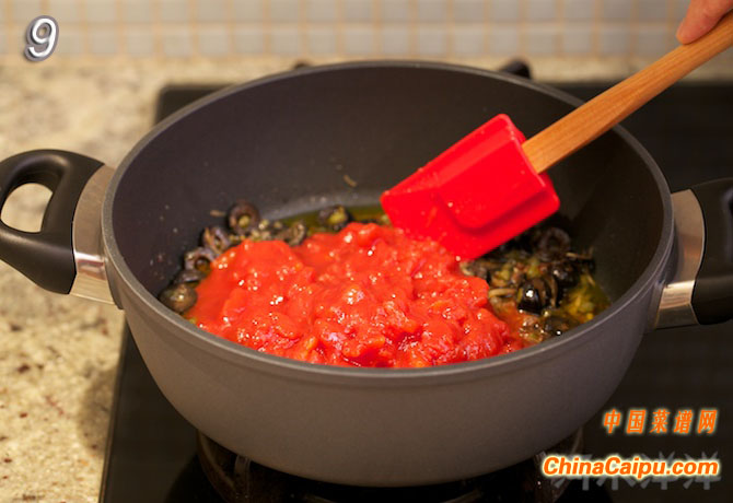 9、加入400克罐头番茄,搅拌均匀,大火加热,等到锅子里开始冒泡的时候再降低到中火加热10分钟,中间需要不断搅拌。