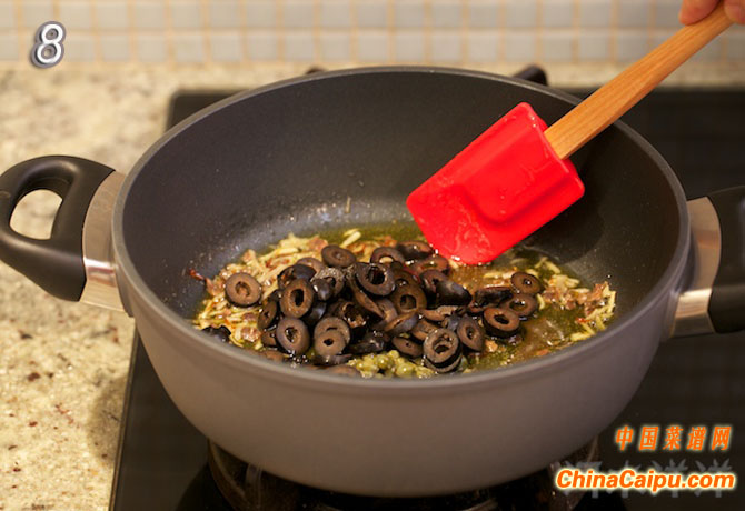 8、等到锅子里的油开始冒小气泡的时候,把炉灶火力降低到中火,加热3分钟辣椒、大蒜和鯷鱼,然后加入切片的橄榄和酸豆,继续中火加热3分钟,让所有食材的味道融合。
