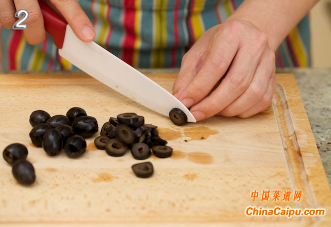 1、准备各种食材。如果有橄榄去核器,就用它把橄榄的核去掉。这个去核器用起来很酷,不过实际用途非常有限,基本上只能给橄榄和樱桃去核。如果没有去核器也不要紧,直接用手指用力一捏橄榄,就可以把果肉部分捏下来,当然形状就没有那么好看了。