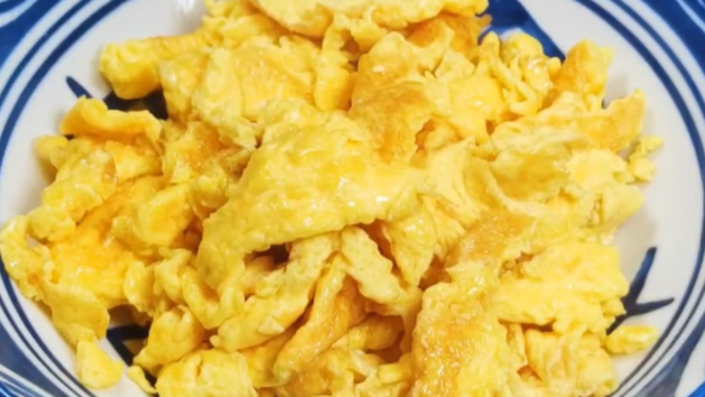 4.起锅烧热,加入少许食用油,油热后把鸡蛋液倒入锅中,开小火慢慢的煎,再用铲子轻轻推动,使鸡蛋受得均匀,这样炒出来的鸡蛋才特别的蓬松。底部煎至定型后再翻一面,一直把我们的鸡蛋炒至定型,再用铲子把鸡蛋划成小块盛出来装入碗中备用。