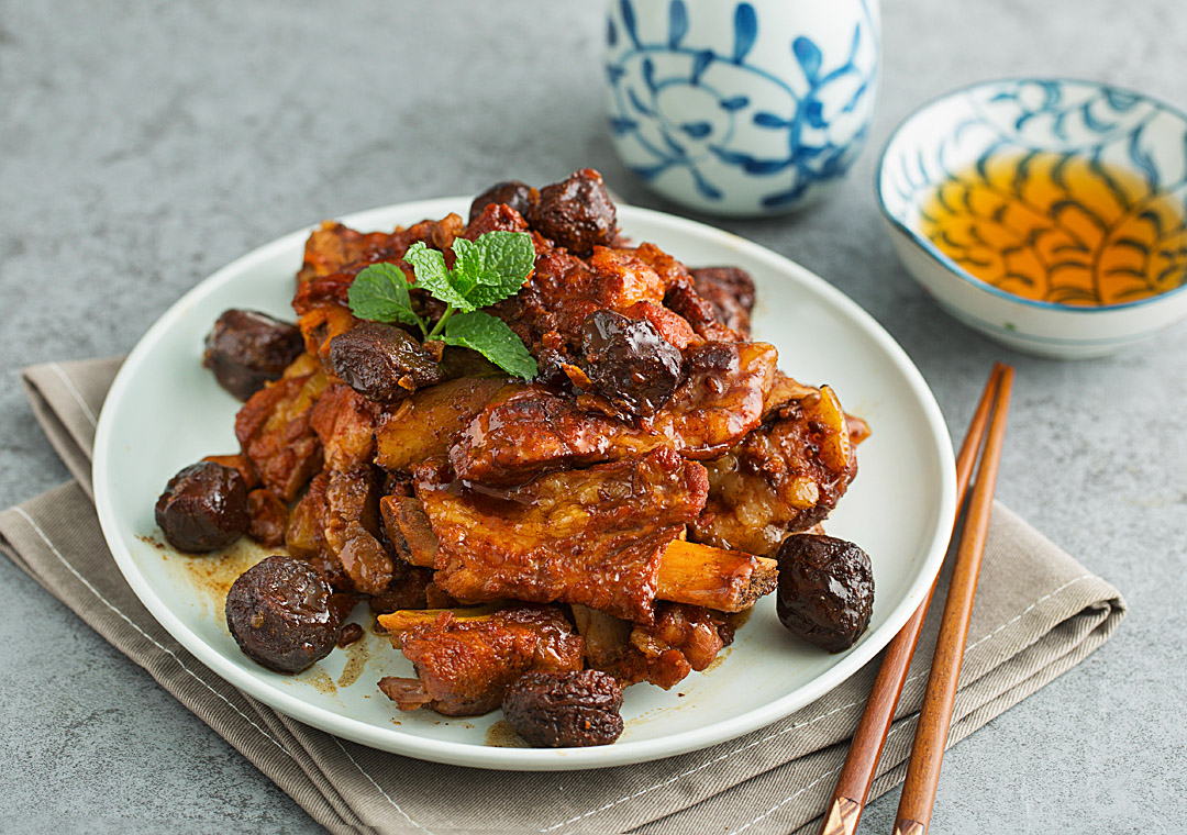 食材:排骨、话梅、葱姜、西瓜酱、八角、桂皮、香叶、冰糖、料酒