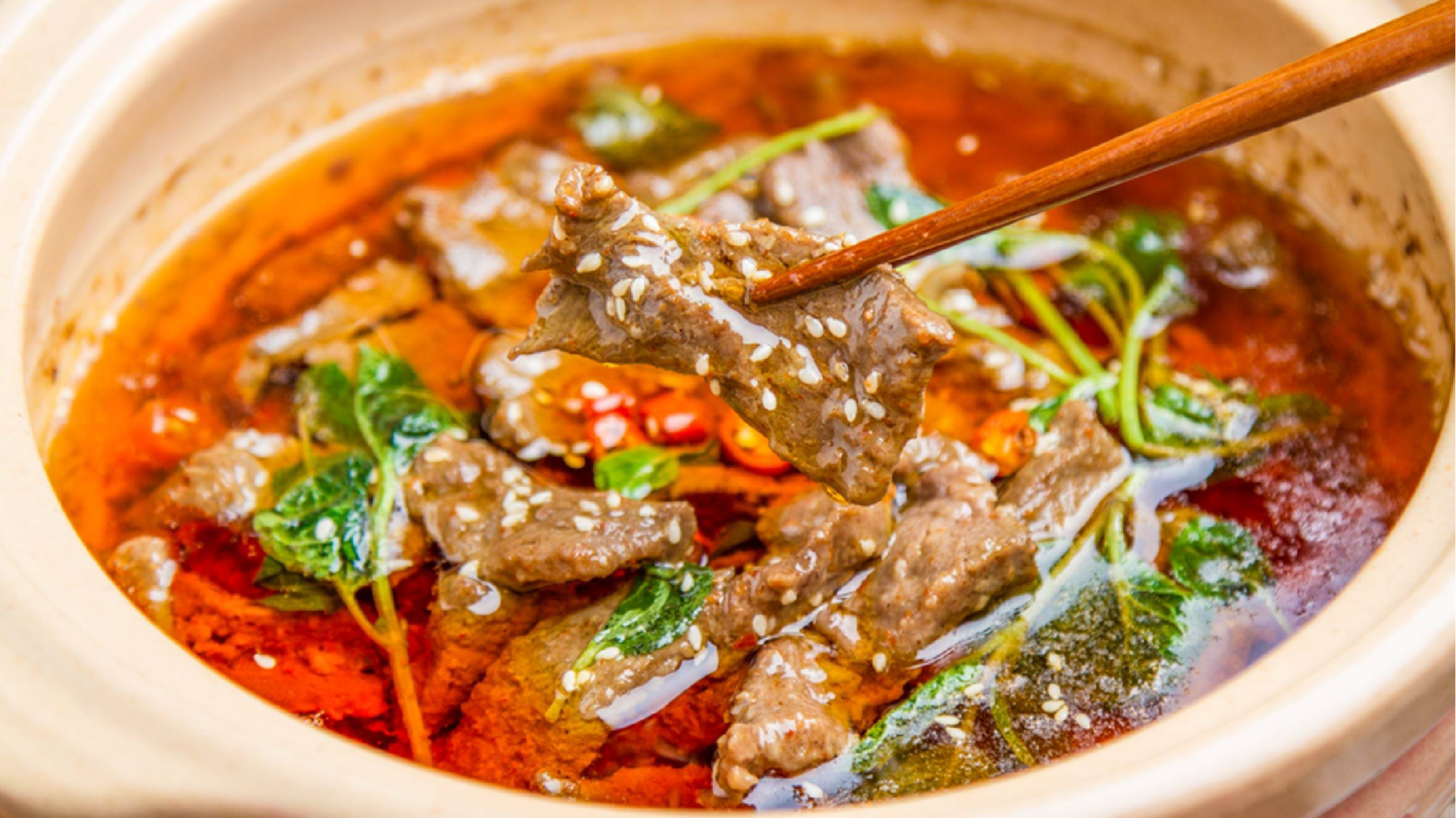 6、放入处理好的薄荷叶,搅拌均匀,继续烧到食材成熟入味后,盛出来,浇上一点牛肉耗辣椒,就可以开吃了;