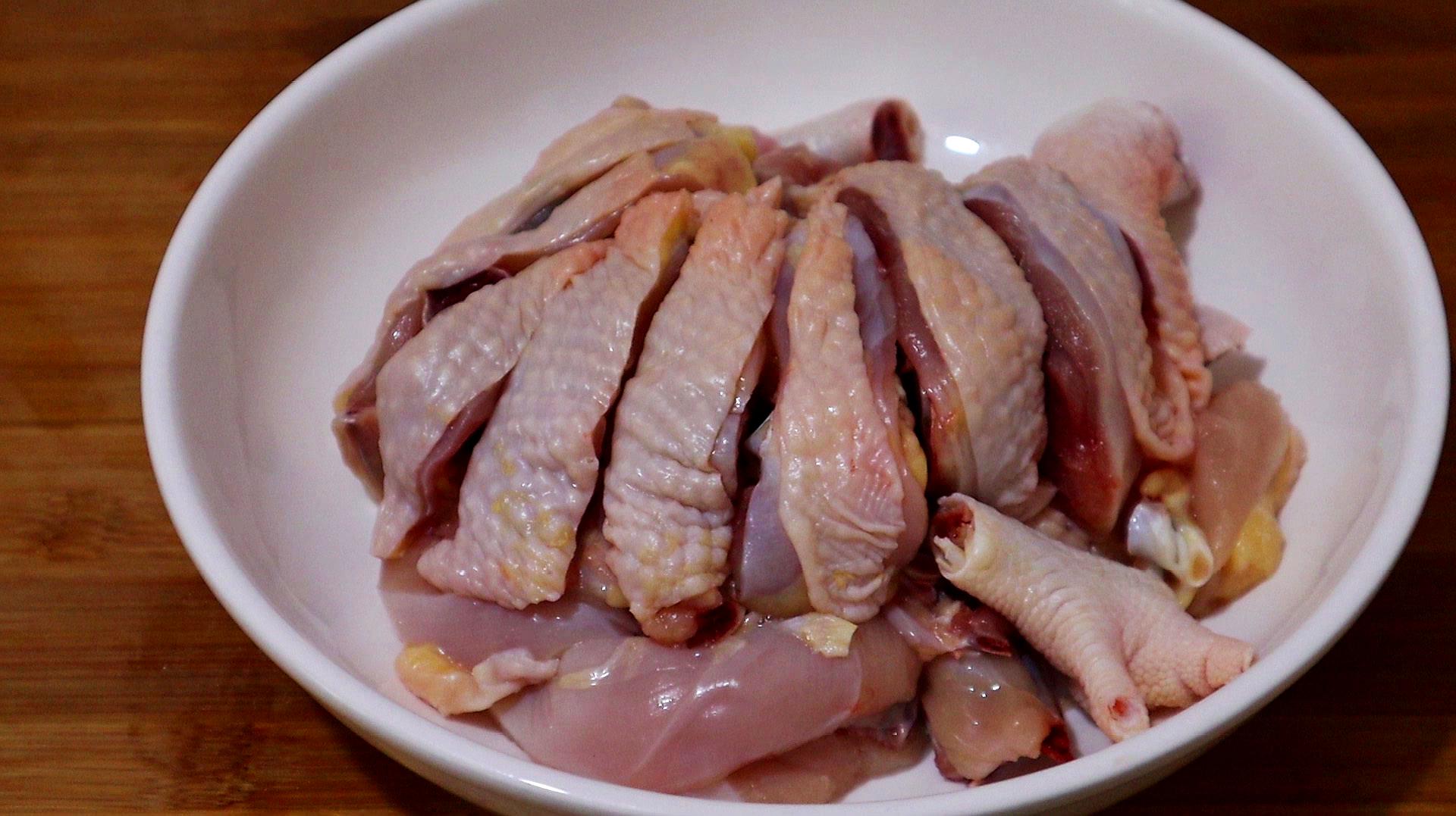 2、接下来,把鸡肉冲洗干净,去掉血水等杂质,切成块,放入热水里面,加入一点料酒,焯煮一会儿后,撇去浮沫,捞出来;