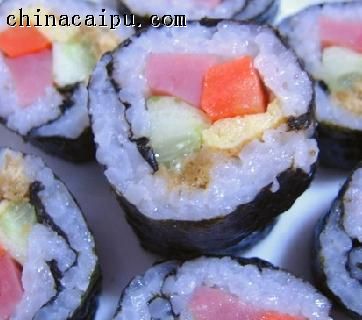原料:黄瓜、胡萝卜、火腿、肉松适量、鸡蛋一个、紫菜、大米、糯米。