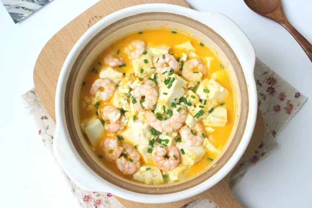 食材:豆腐、蘑菇、鲜虾、西瓜酱、葱姜、料酒、盐