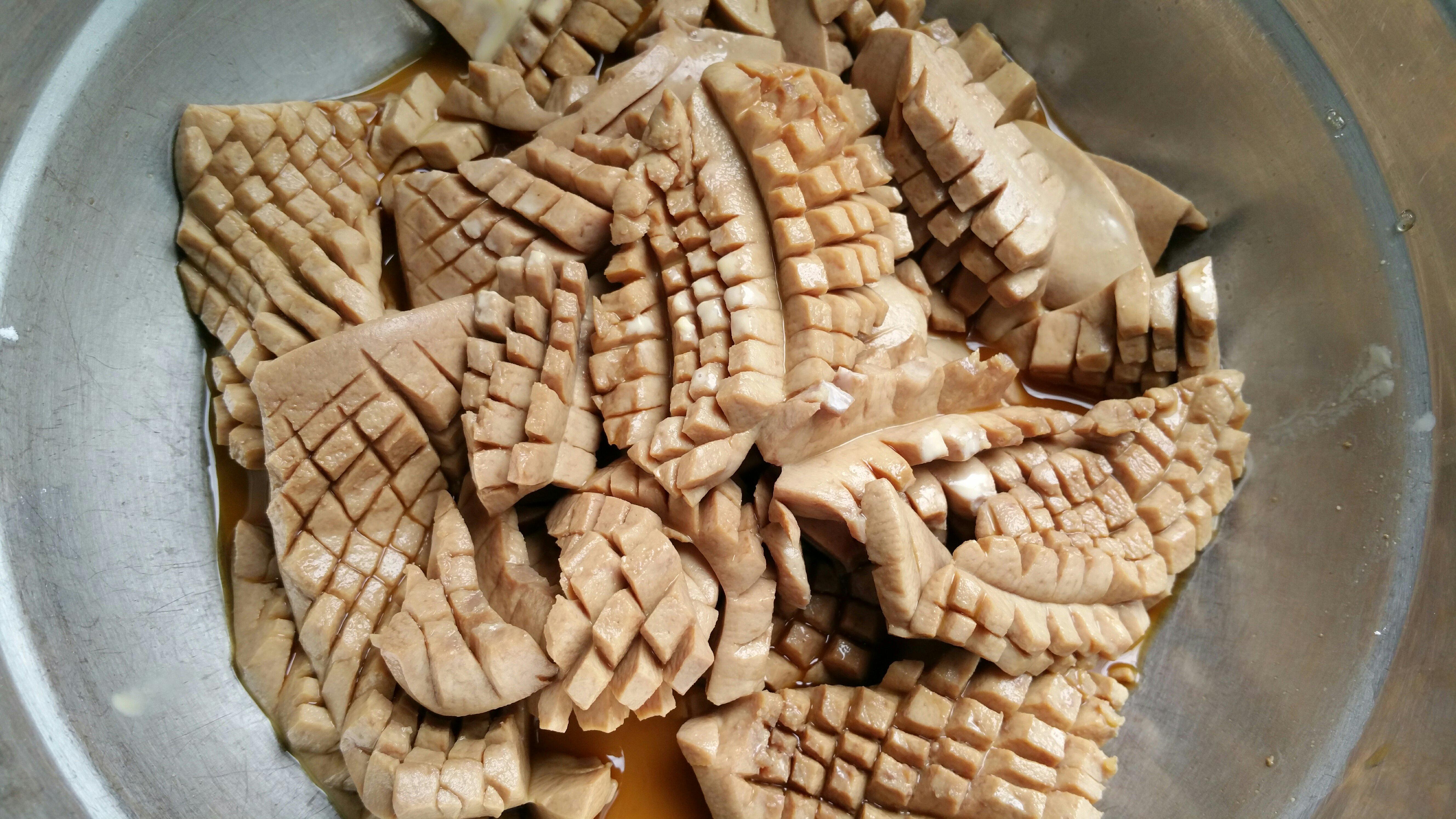 2、接下来,把猪腰冲洗干净,去掉筋膜等杂质,切成腰花,放入热水里面焯烫一下后捞出来,沥干水,加入一点盐和料酒,腌制一会儿;