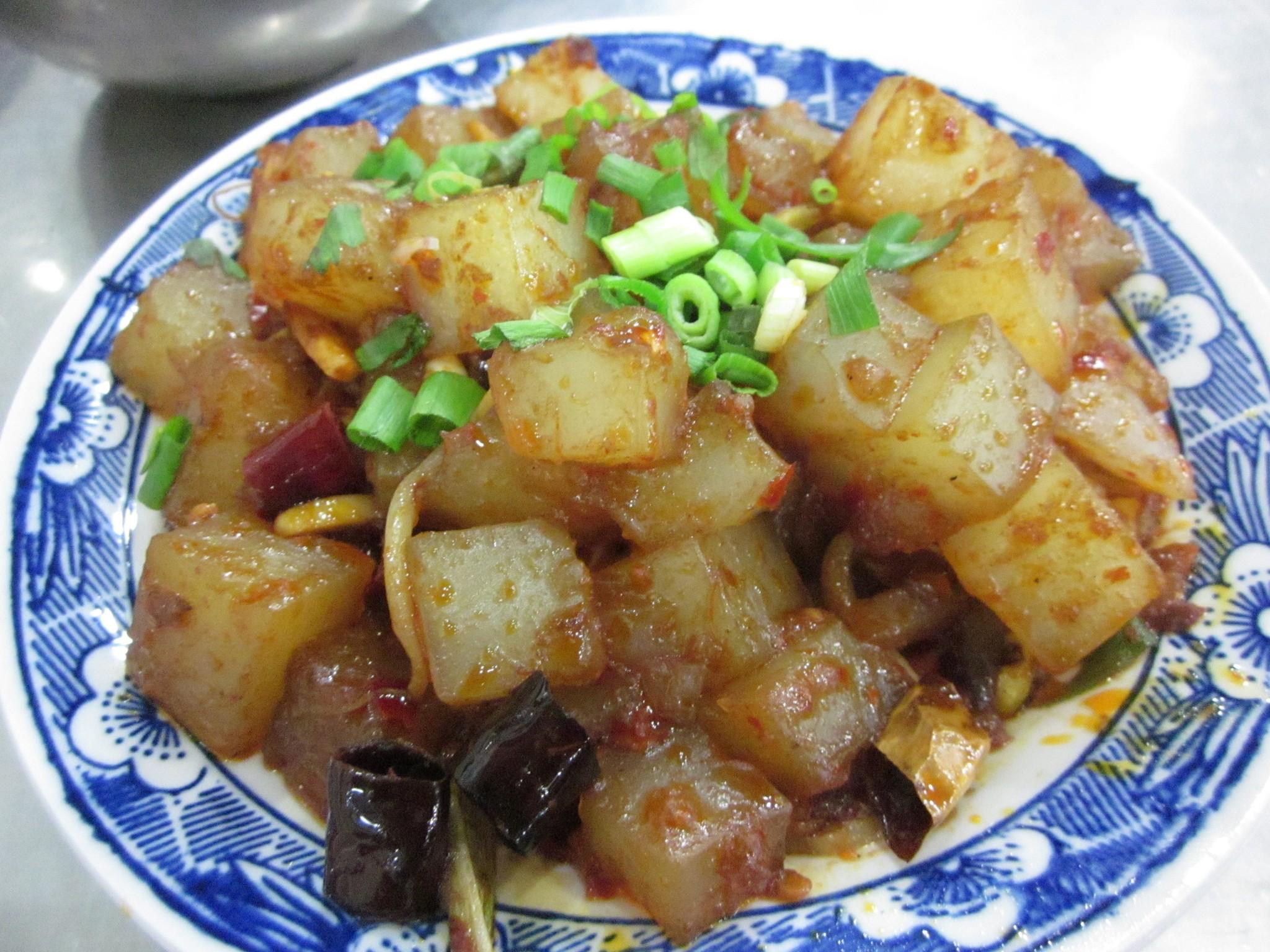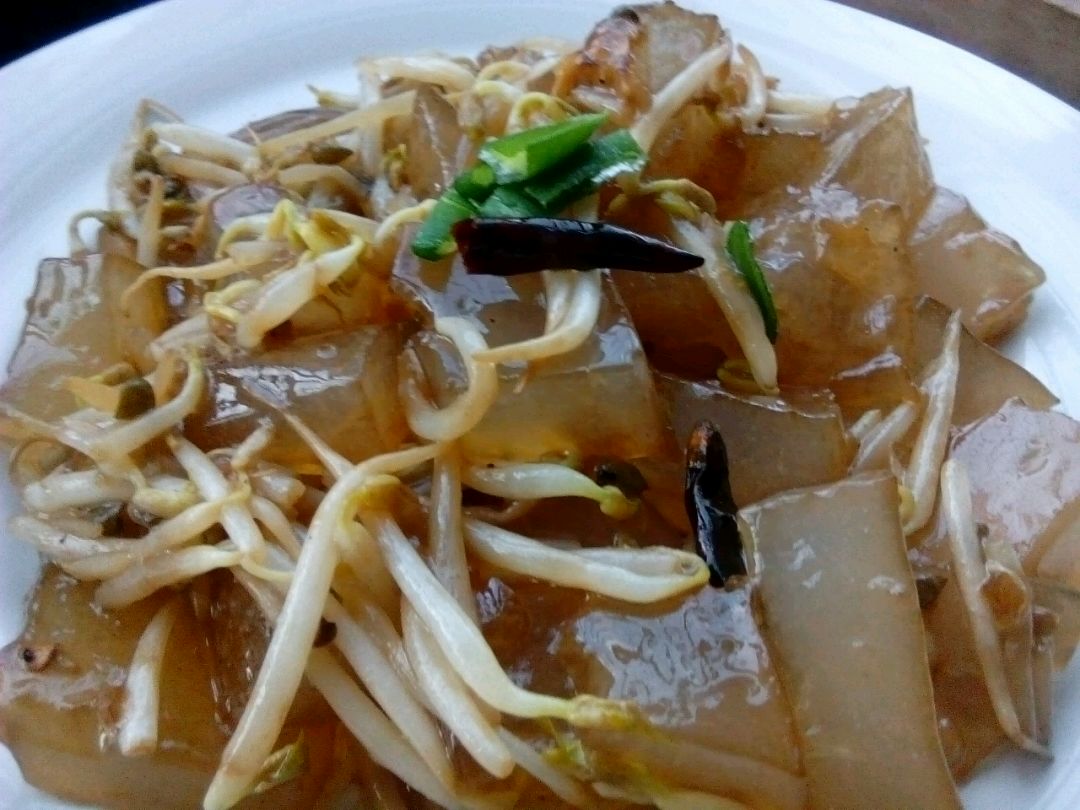 食材:凉粉、牛肉耗辣椒、虾皮、葱姜蒜、青椒、猪肉、胡椒粉、料酒、酱油、盐