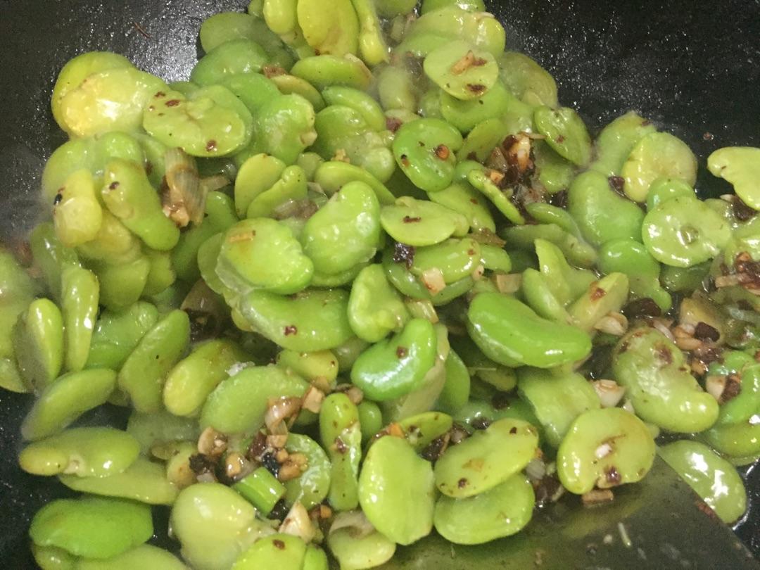 6、然后热锅烧油,放入蚕豆,煸炒到蚕豆两面金黄,不用盛出来,倒入搅拌好的料汁,