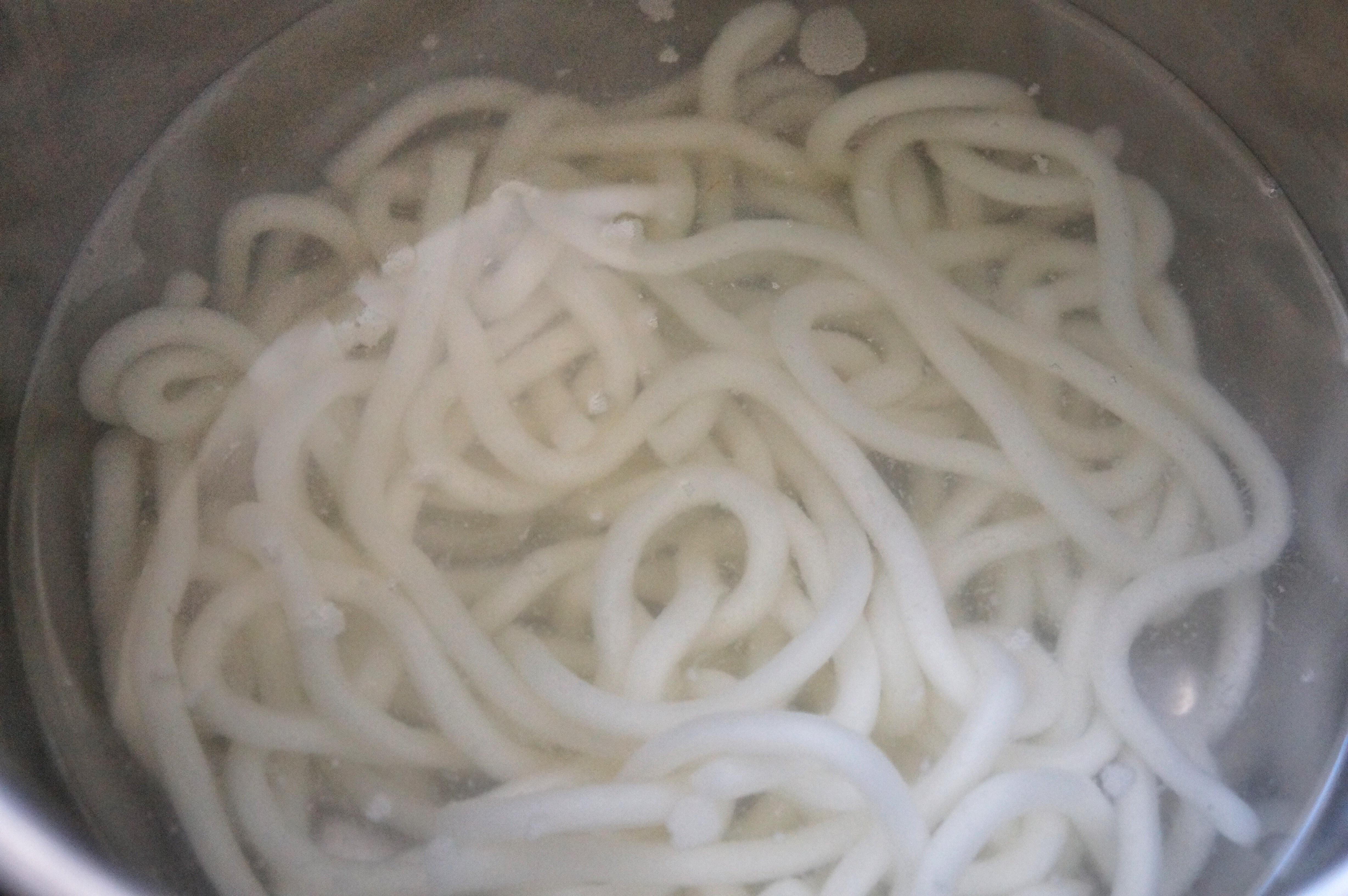 6、再把乌冬面放入清水过一下,捞出来,沥干水,放入焖豆角的锅里面,等到把乌冬面焖到成熟入味,淋入适量的蚝油,搅拌均匀;即可;