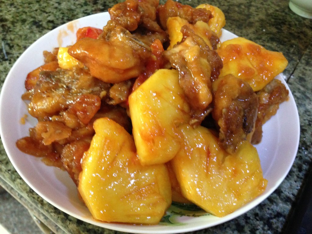 食材:凤梨、苦瓜、西瓜酱、鸡腿、葱姜蒜、干红辣椒、酱油、料酒、蚝油、白糖、盐