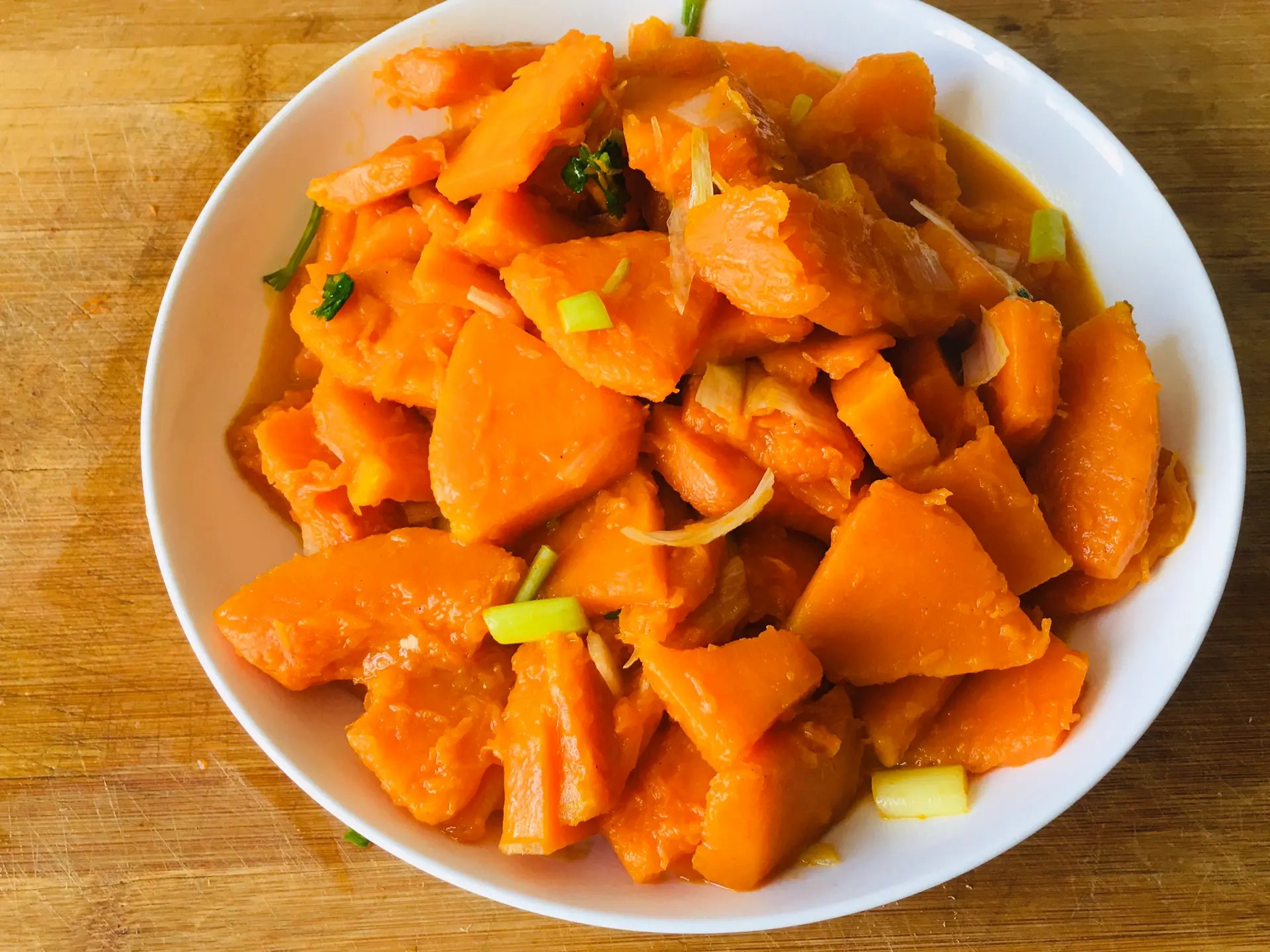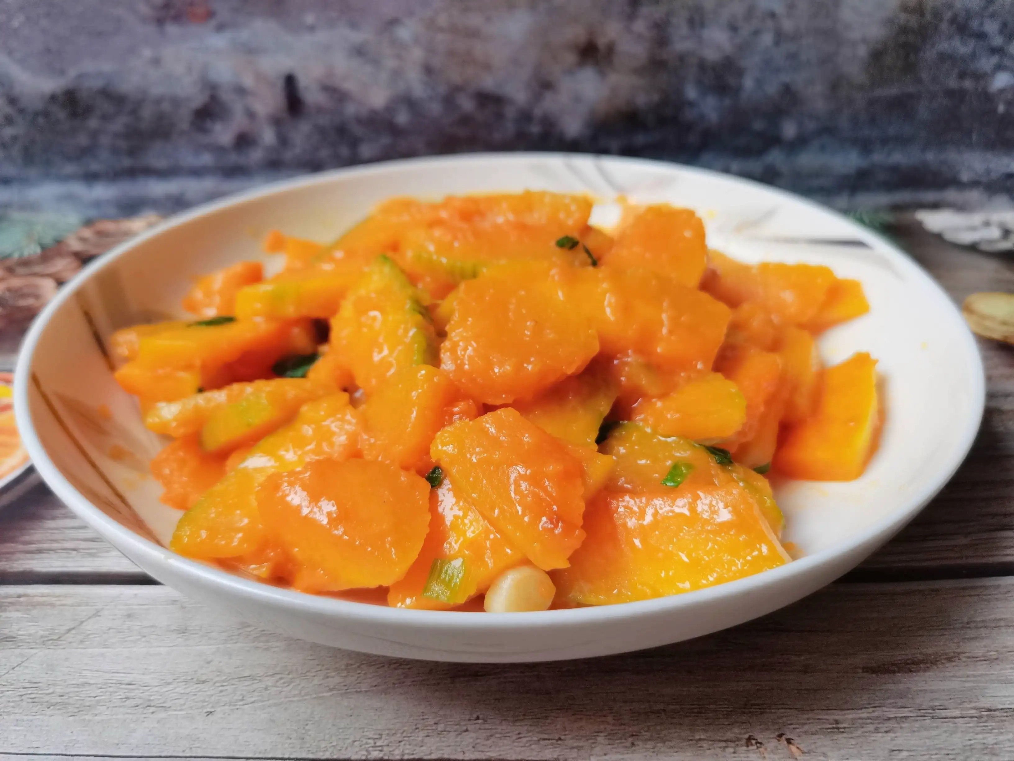 食材:南瓜、西瓜酱、小葱、蒜瓣、胡椒粉、酱油、盐