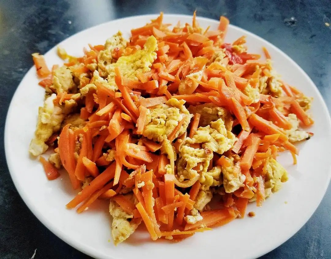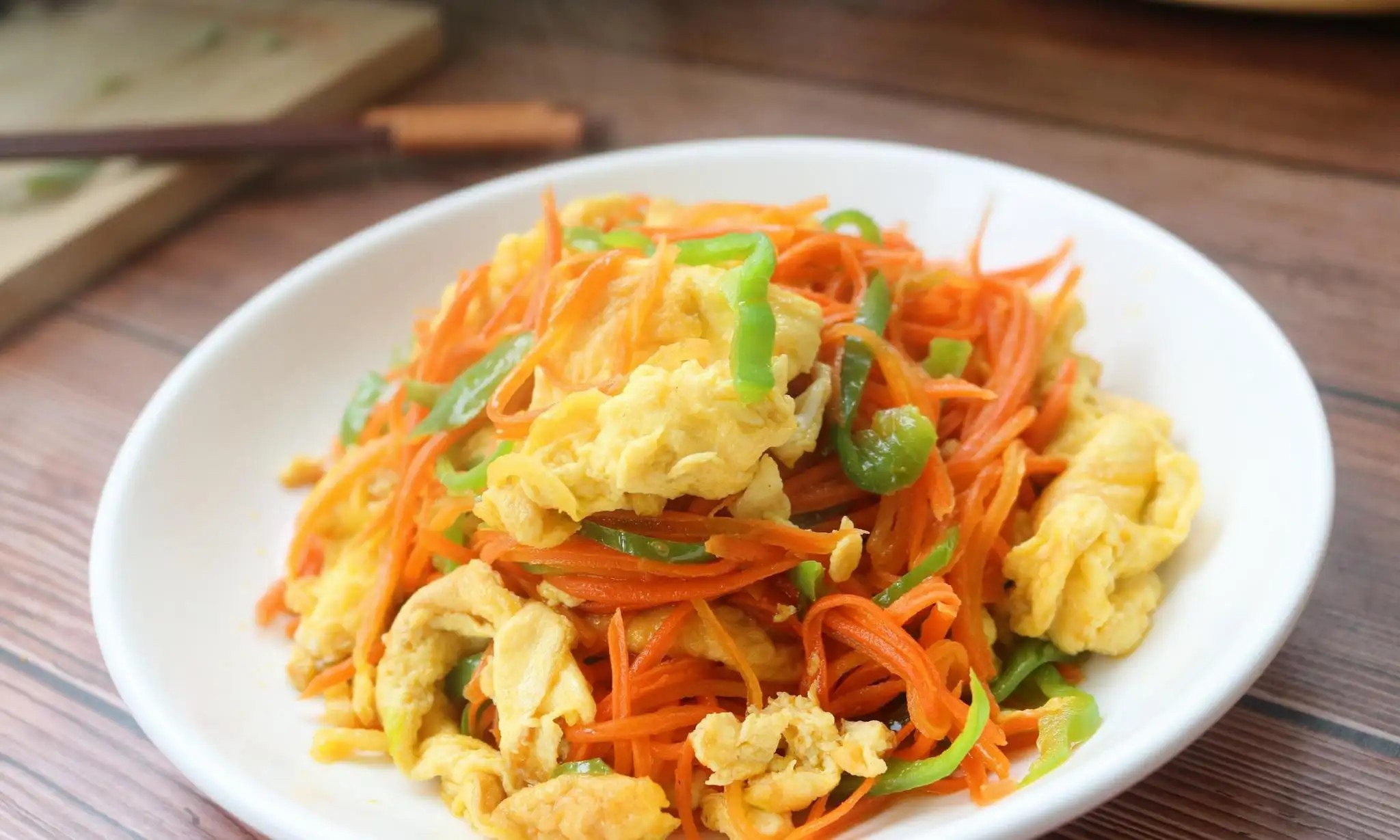 食材:胡萝卜、鸡蛋、牛肉耗辣椒、葱姜、青椒、盐