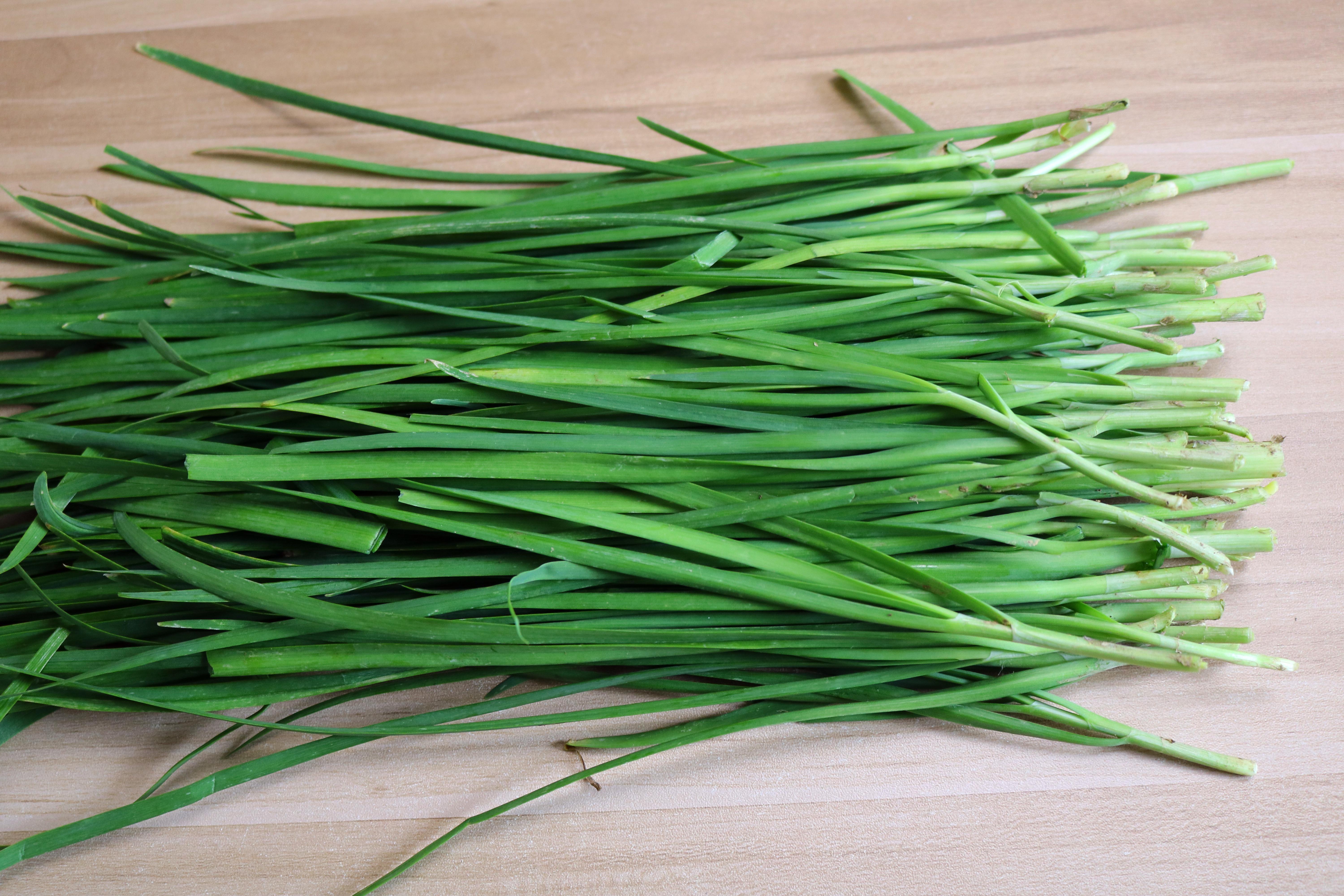 2. 接着,将韭菜择洗干净,切去根部,切成韭菜碎;青椒洗净,去籽,切成丁;