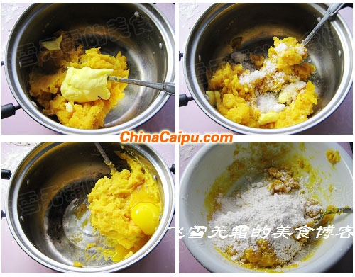 6,再加入白糖用小火将红薯泥煮干,如果喜欢加淡奶油或炼乳在这一步放入。