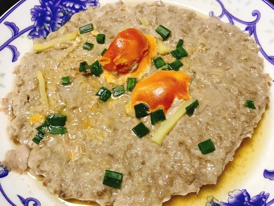 做法:1、我们需要是先把准备好的食材都处理好,把猪肉仔细地冲洗干净,去掉杂质,切成肉末;把咸鸭蛋蛋黄切成两半,放入小盆;