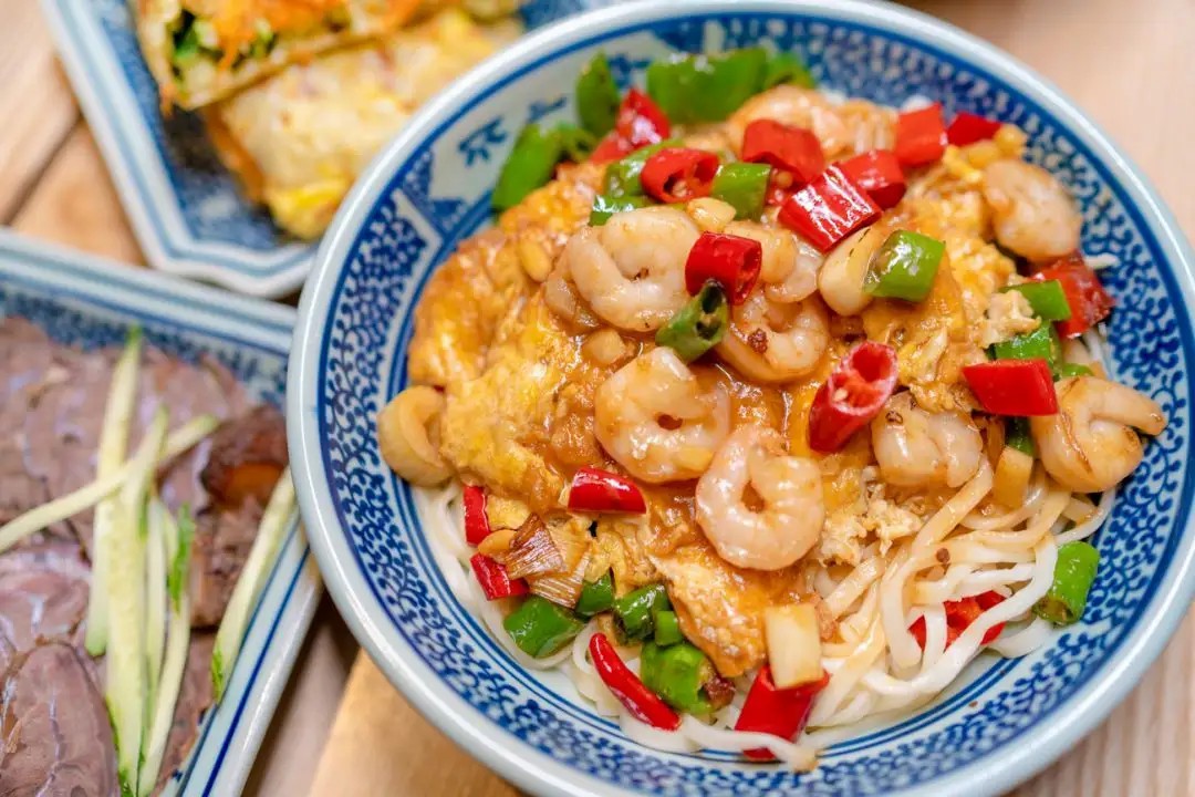 食材:大虾、牛肉耗辣椒、大葱、面条、酱油、胡椒粉、蚝油、醋、盐