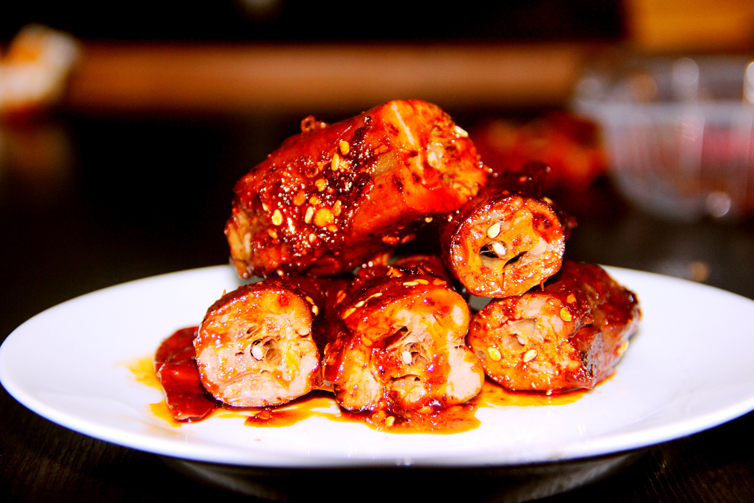 食材:鸭脖、蒜蓉辣酱、葱姜、干红辣椒、花椒、茴香、桂皮、香叶、酱油、白糖、盐