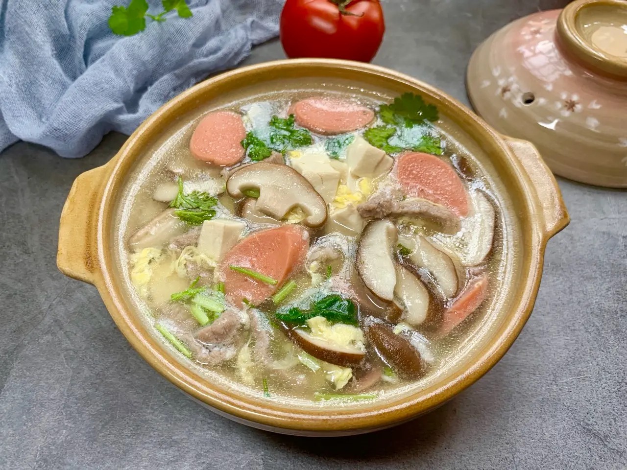 美味的火腿豆腐平菇汤