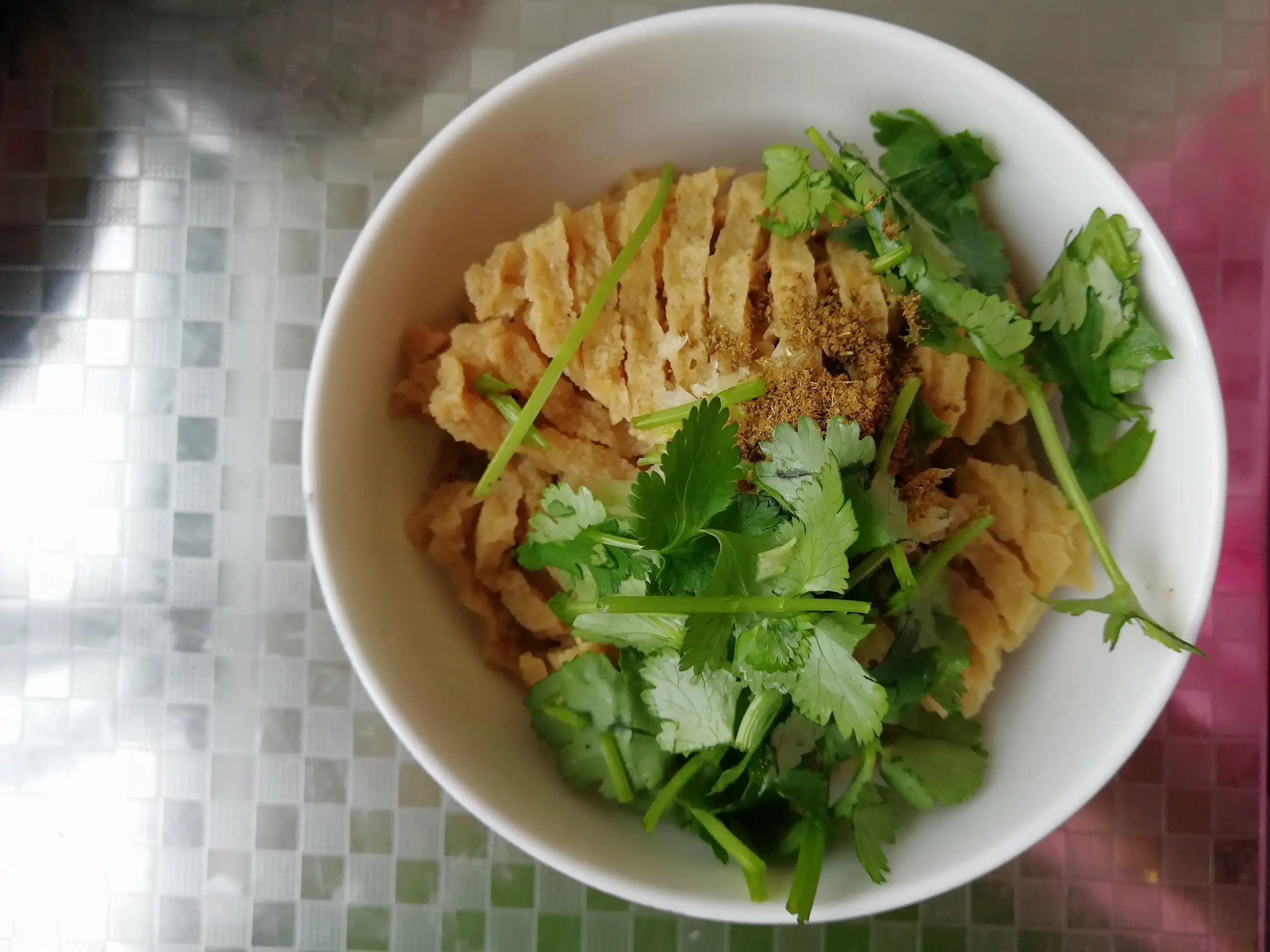 5、然后把煮炖好的豆腐串放入盛着料汁的盆里,浸泡一段时间,撒些香菜碎;就可以开吃啦;