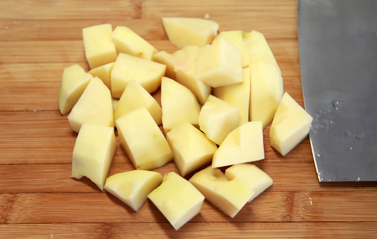 3、然后热锅烧油,等到油热后,放入土豆块,煎到土豆两面金黄后,盛出来,沥干油;