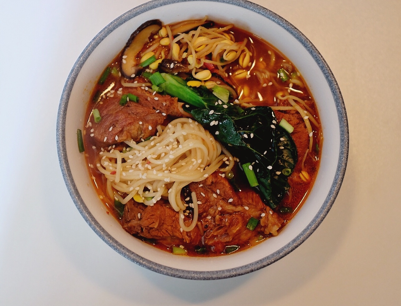 食材:排骨、西瓜酱、番茄、面条、葱姜蒜、香菜、淀粉、酱油、胡椒粉、料酒、香油、盐