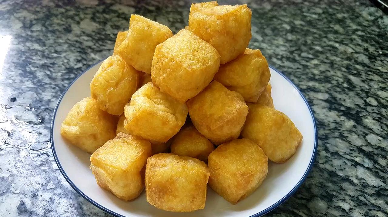 4、然后热锅烧油,放入油豆腐,两面都煎炸一会儿,倒入适量的高汤,加入一点酱油和白糖,小火煮到油豆腐成熟入味后盛出来;
