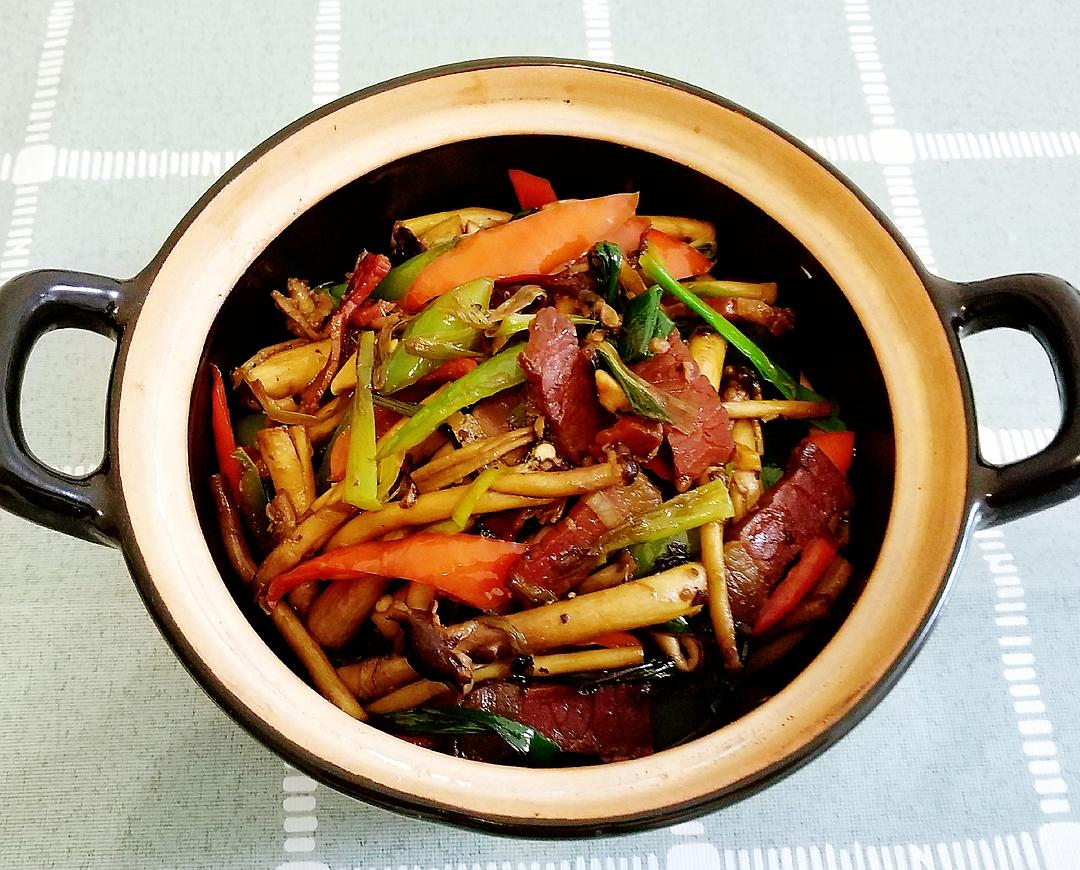 食材:茶树菇、腊肉、西瓜酱、葱姜蒜、辣椒、胡萝卜、味精、胡椒粉、盐