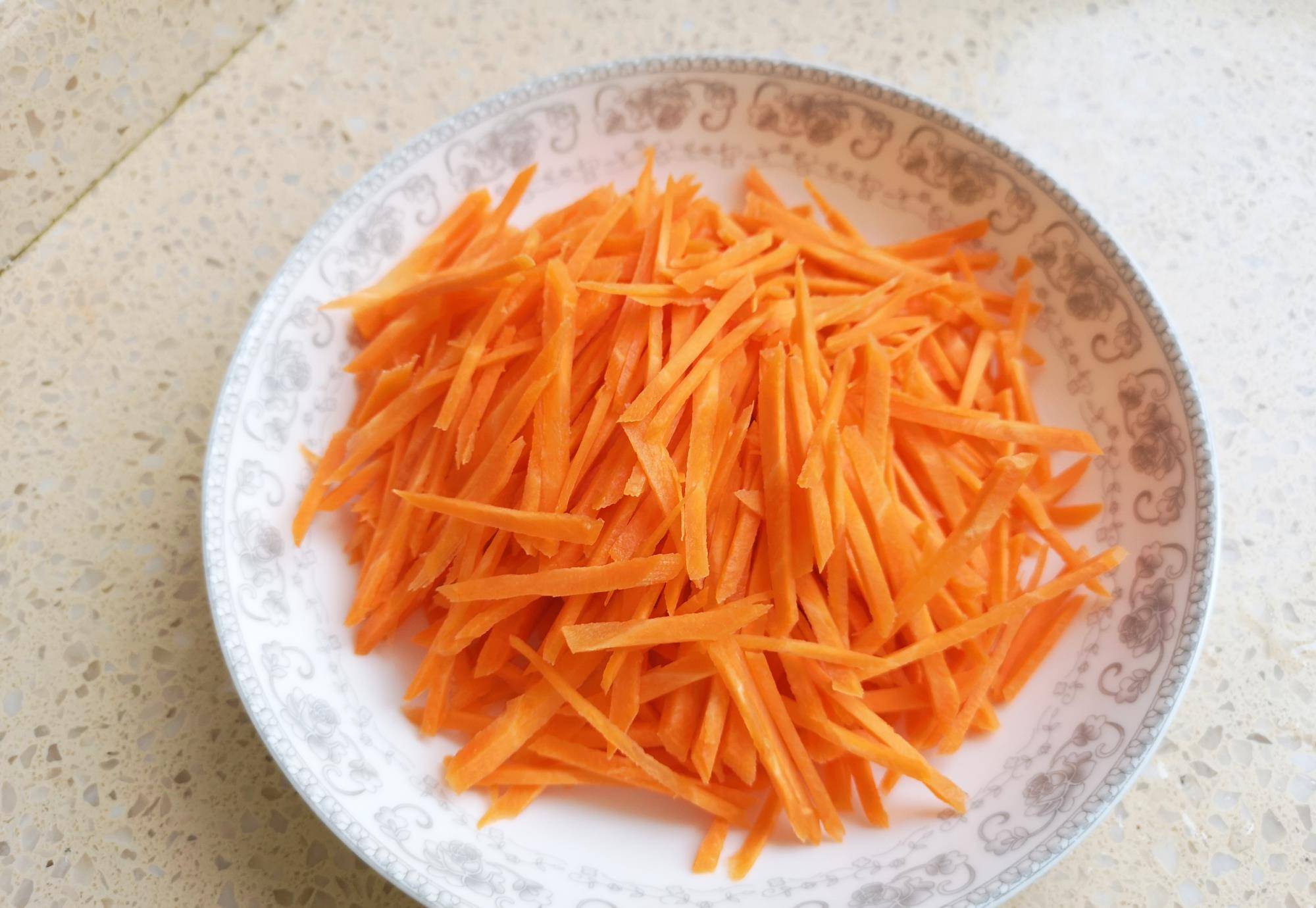 做法:1、先把胡萝卜冲洗干净,去掉杂质后,切成胡萝卜丝;把葱姜洗净,切成葱花和姜丝;