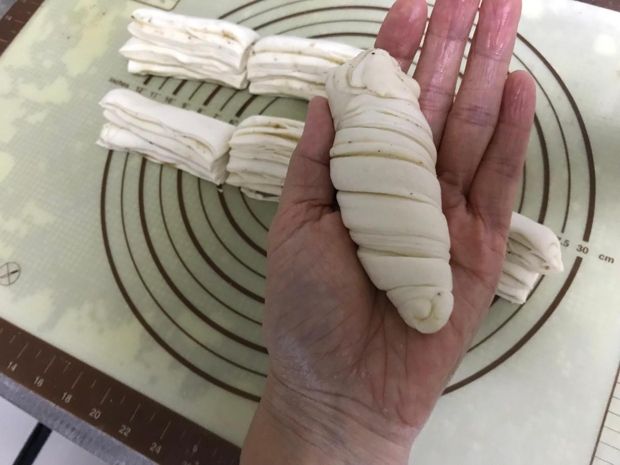 9、将分好的面段,用手先握住一端,另一端捏着顶端,开始拧转成一个锥形状态,如图所示。