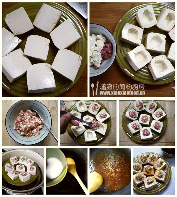 2、豆腐切块的时候不要切太薄,否则就没法挖空了。