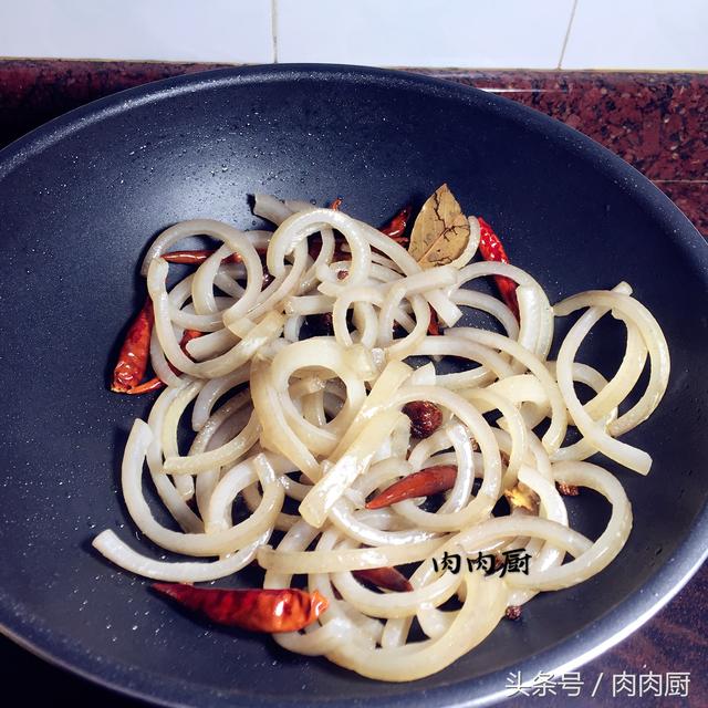 5、起干净锅热油倒入香料炒香,然后加入猪皮继续大火翻炒。
