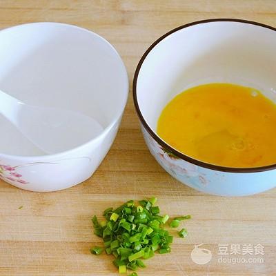 2、鸡蛋打散,淀粉放入碗中填入100g清水,搅拌均匀,香葱叶切小段~