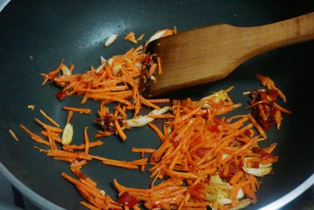 8.放入剁椒半勺和郫县豆瓣酱半勺炒出红油。再放入胡萝卜丝翻炒,至胡萝卜变软。