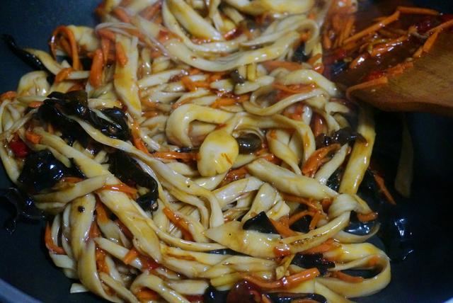 9.放入杏鲍菇和木耳,翻炒均匀。