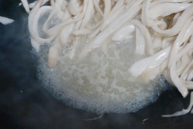 4.炒到杏鲍菇变软出水,开大火继续翻炒。