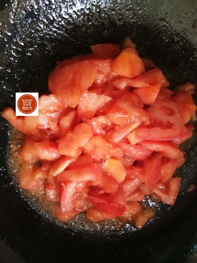 5、炒锅洗净,再次放少许底油,油温升高后放入西红杮大火煸炒,待有汤汁出来时,改小火。
