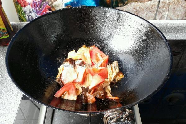 2.热锅凉油煸香葱姜末,然后倒入一半番茄碎炒出汤汁,随后倒入腐竹和木耳炒匀,在放入番茄大块炒匀